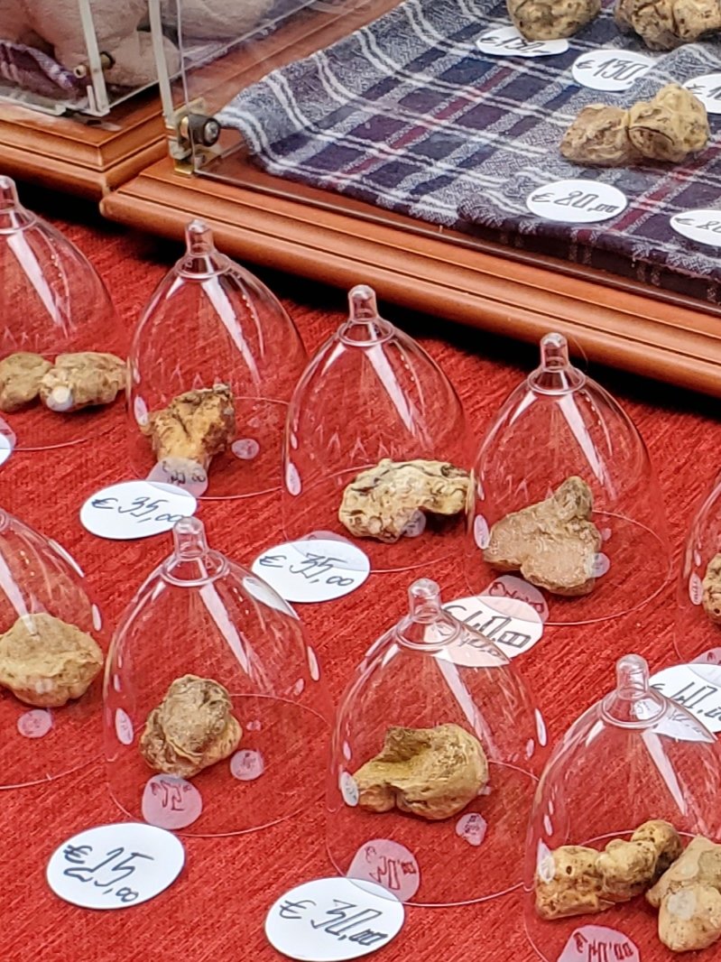 bottom: white truffles under glass with their individual prices, which range from about $10-$30 each. Crazy and weird.