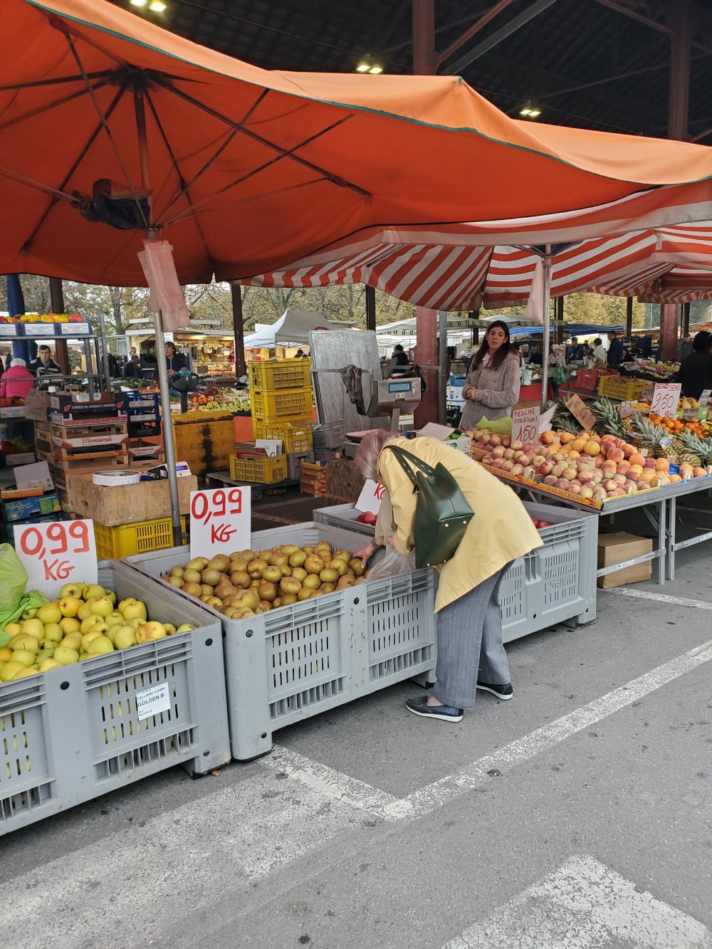 Saturdays are the huge market day here, and I walked over early to see what it was all about. I was in search of fruit and vegetables, but there were streets full of everything else: men’s and women’s clothes, shoes, purses, and all sorts of household goods. The tables were chock-full of merchandise. I walked around for about an hour, then went back to where we are staying so the two of us could check things out.