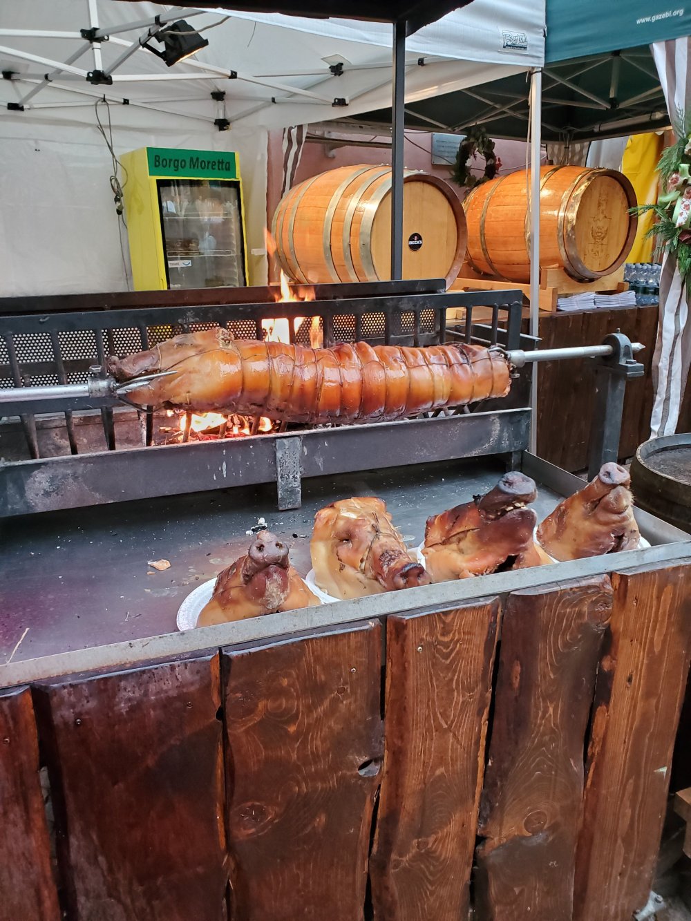 We made our way to the truffle tent, where dozens of vendors were selling their white and black truffles. It takes forever to make a sale since they add the cost each truffle individually and they have to wrap them carefully. There is an official judging area for those who are skeptical about the value of what they bought. So there were lines of people everywhere and the whole place was very busy.