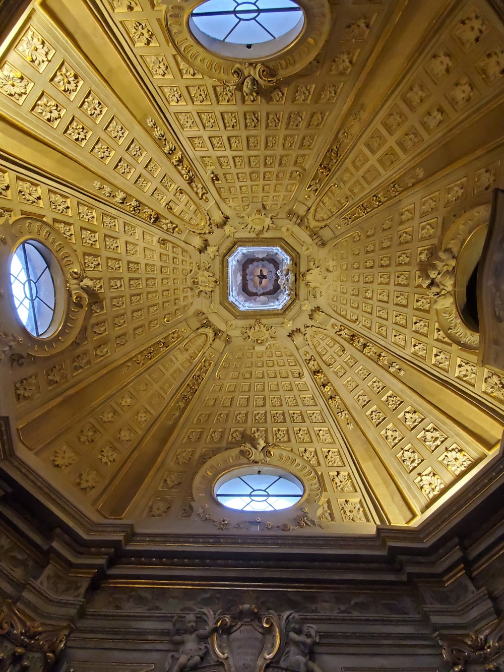 the ornate ceiling insiijs the church in town; market day beyond the arch