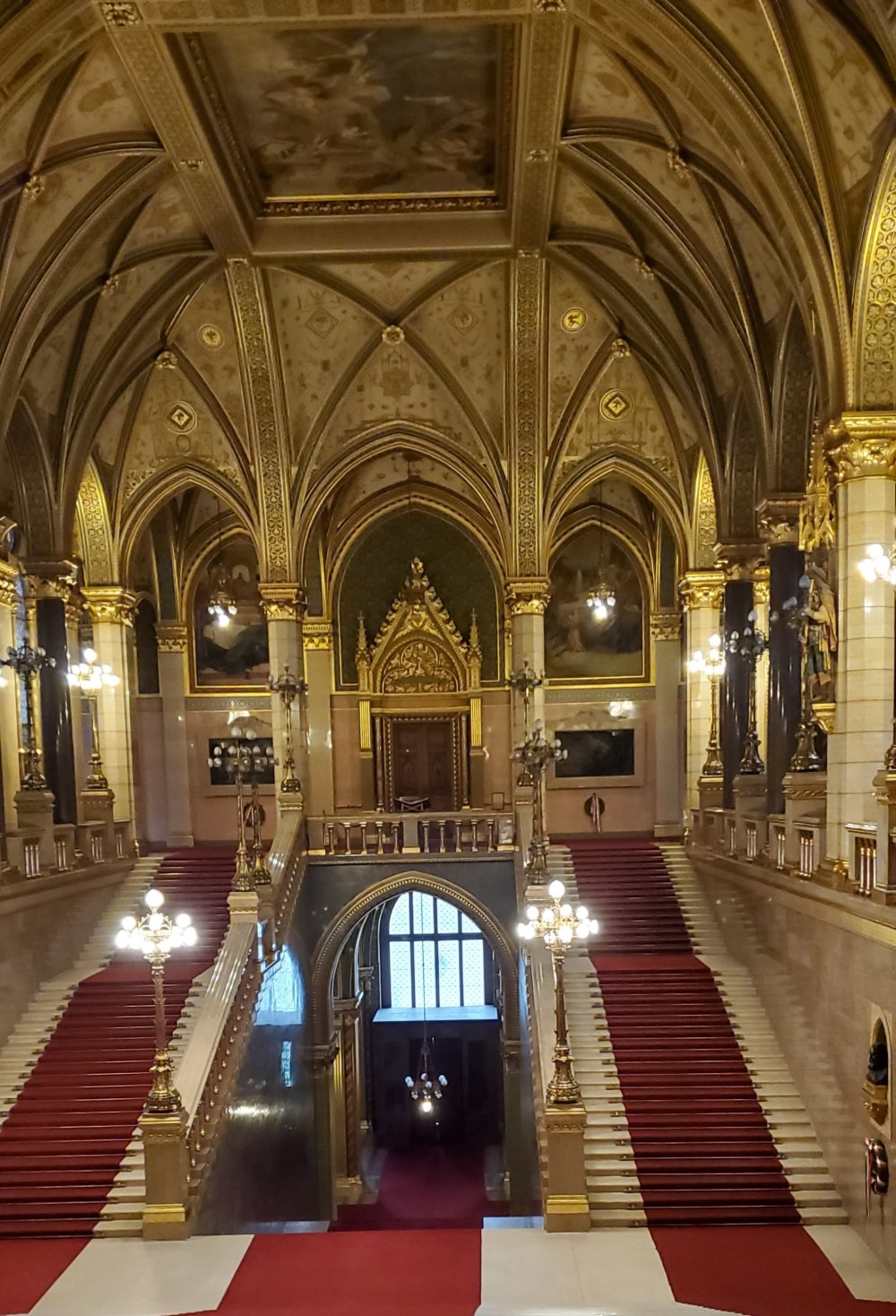 After breakfast, we walked to the House of Parliament, about a half-hour away on the banks of the Danube River, and took a tour. Aside from checking out a courtroom and seeing the heavily guarded Holy Crown (no photos permitted) we learned of the importance of the number 96 to Hungary. No building can be built to be over 96 meters, so it is not higher than St. Stephen’s Basilica and the Parliament building – important to church and state. Additionally, the main staircase in to Parliament has 96 steps, and the number figures importantly in other ways too numerous to mention.