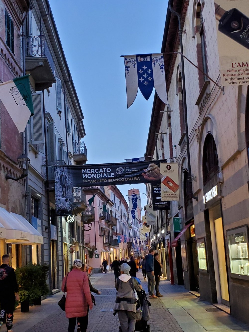 Alba this evening, the banner is for the Truffle Festival on Sunday