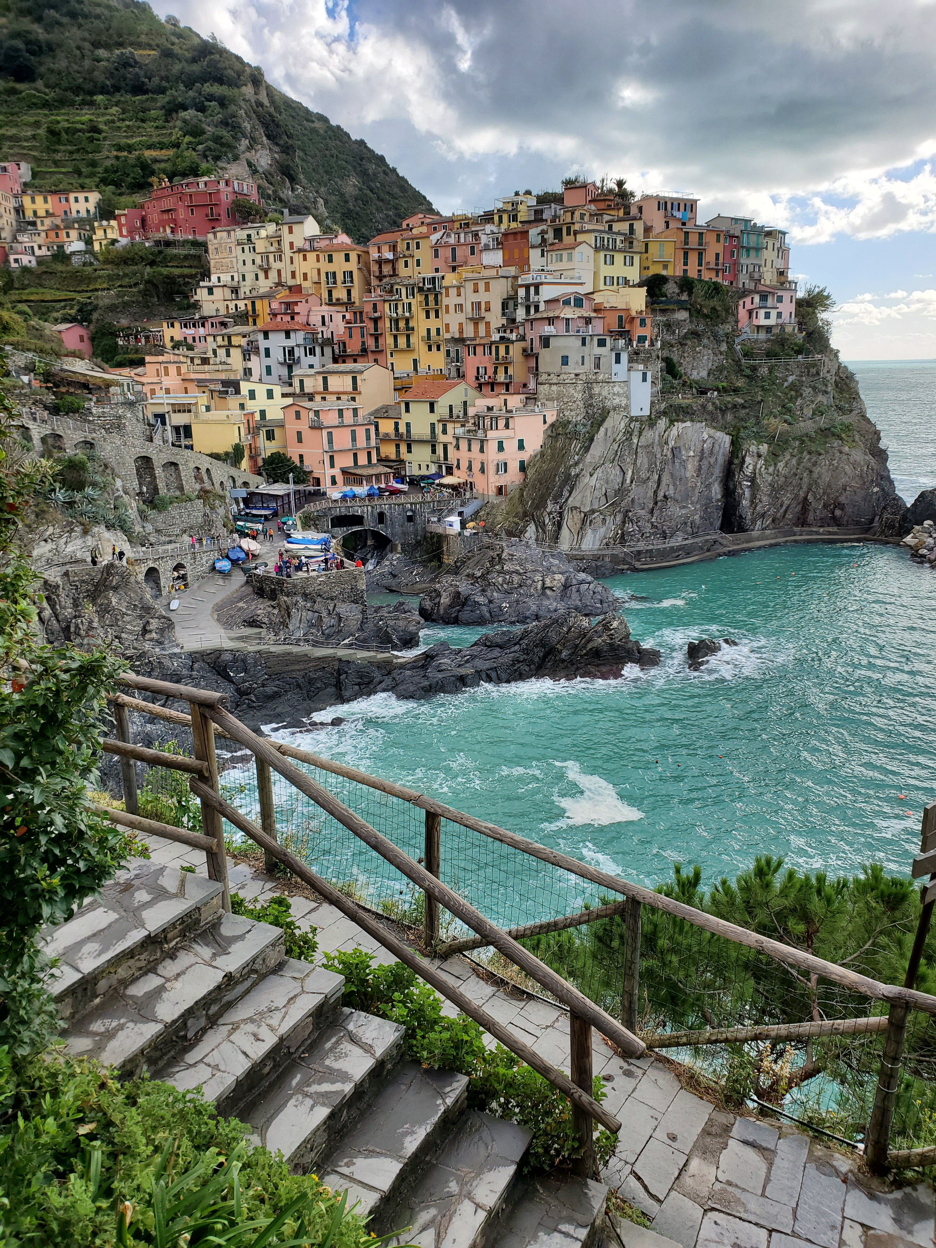 We visited Manarola in the Cinque Terre region today. The five old towns are all linked along the Italian Riviera coastline. In good weather it is possible – and fun – to hike from town to town. This takes about six hours with few stops, but to enjoy the towns and their breathtaking scenery, at least a couple days’ trip is a better idea.