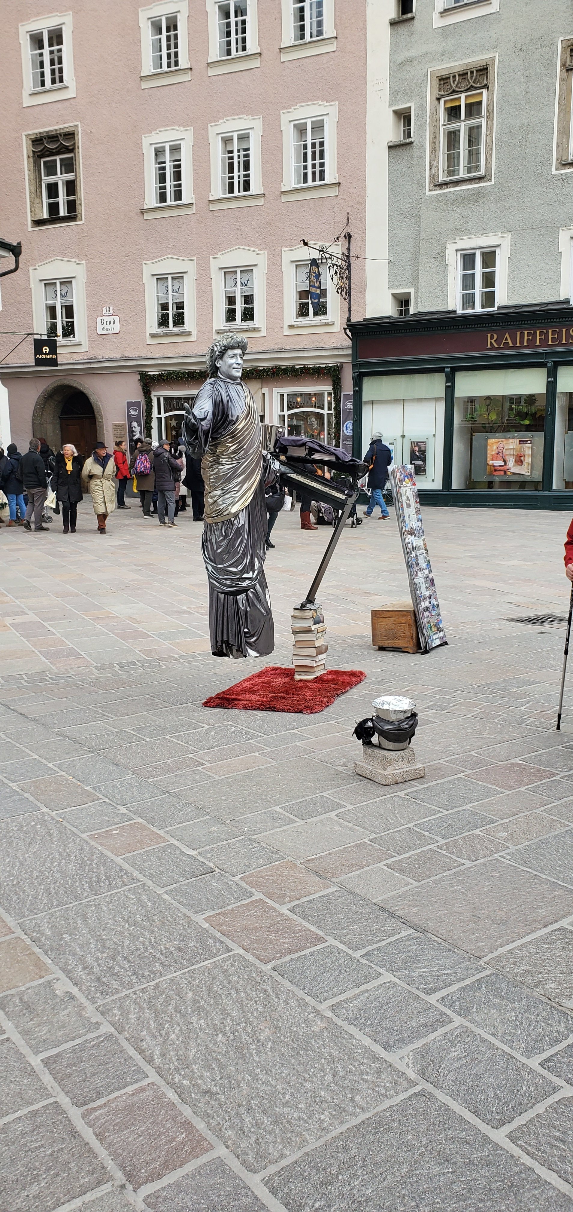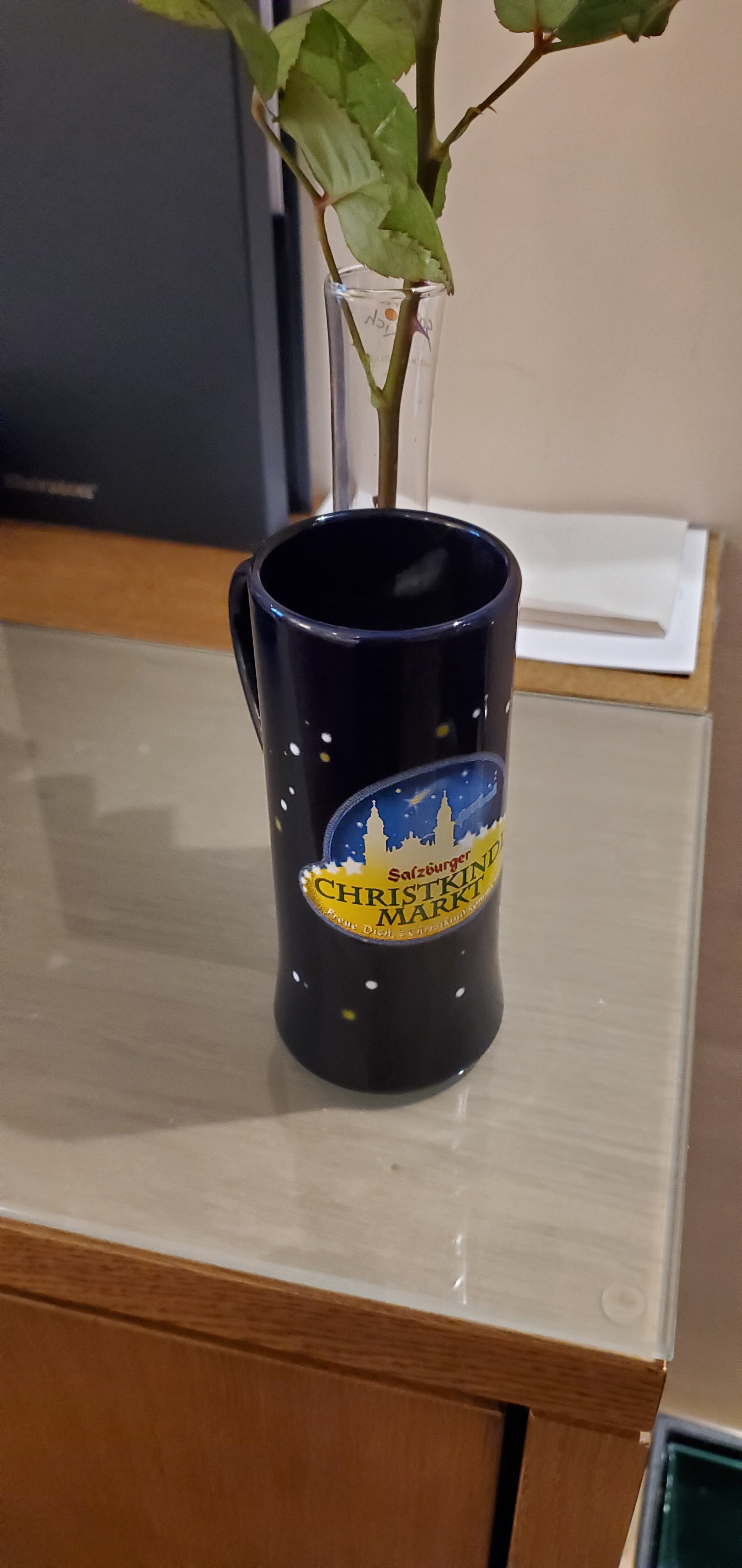 photos: Mulled wine mug from Salzburg’s holiday market; the river today; a street performer seeming to defy gravity.