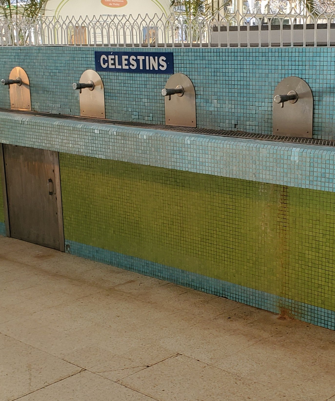 We had a relaxing Tuesday in Vichy. After a couple of raisin pastries and coffee at a patisserie in the city, we were off to the Hall des Sources. This 1903 building is where the medicinal Vichy water is sourced. The water is said to cure all kinds of ailments and to be good for overall health. There are a few different thermal springs in the city and sourced in the building, but only one of them is accessible to the public. The others are only available with a doctor’s note.