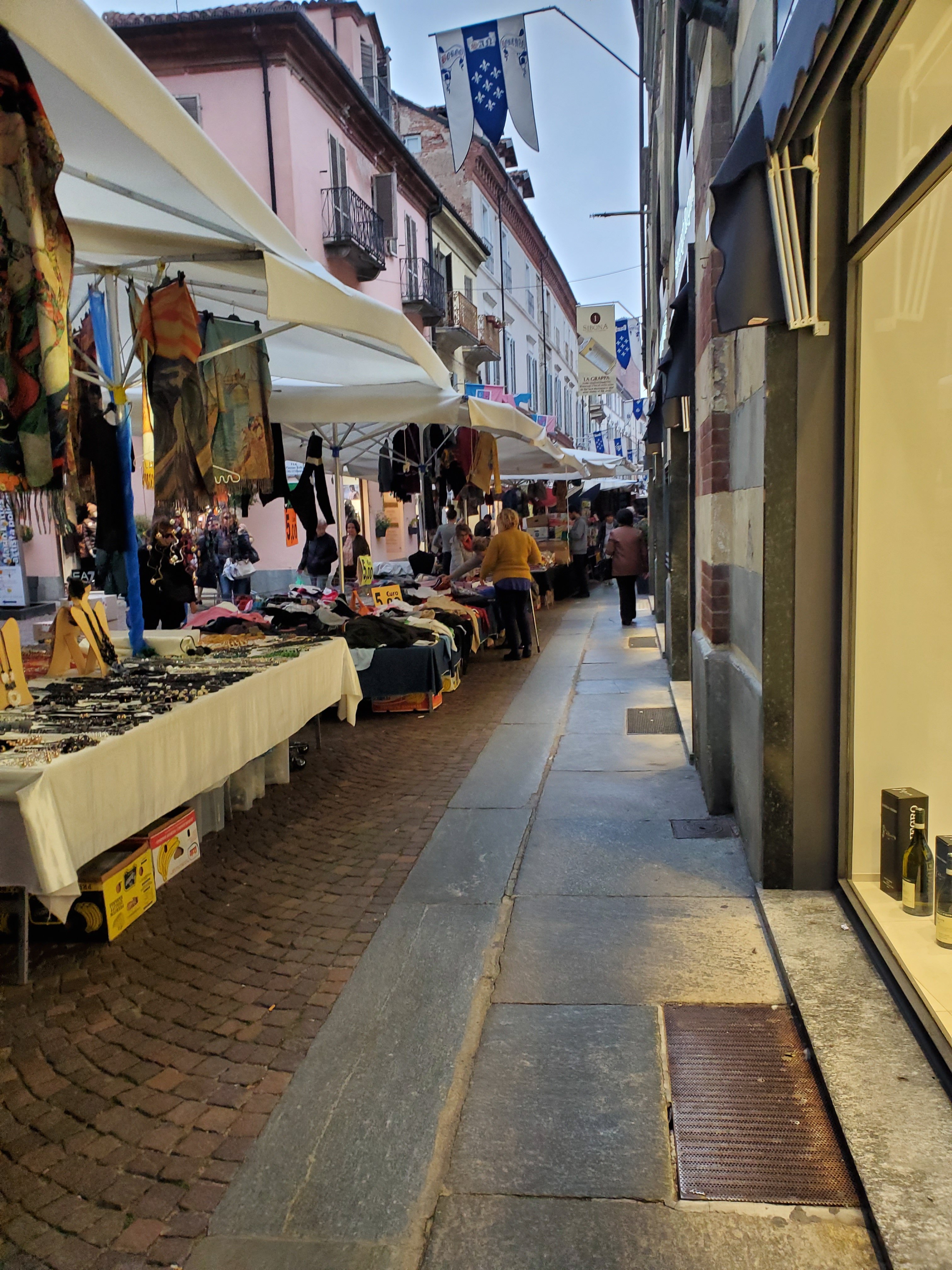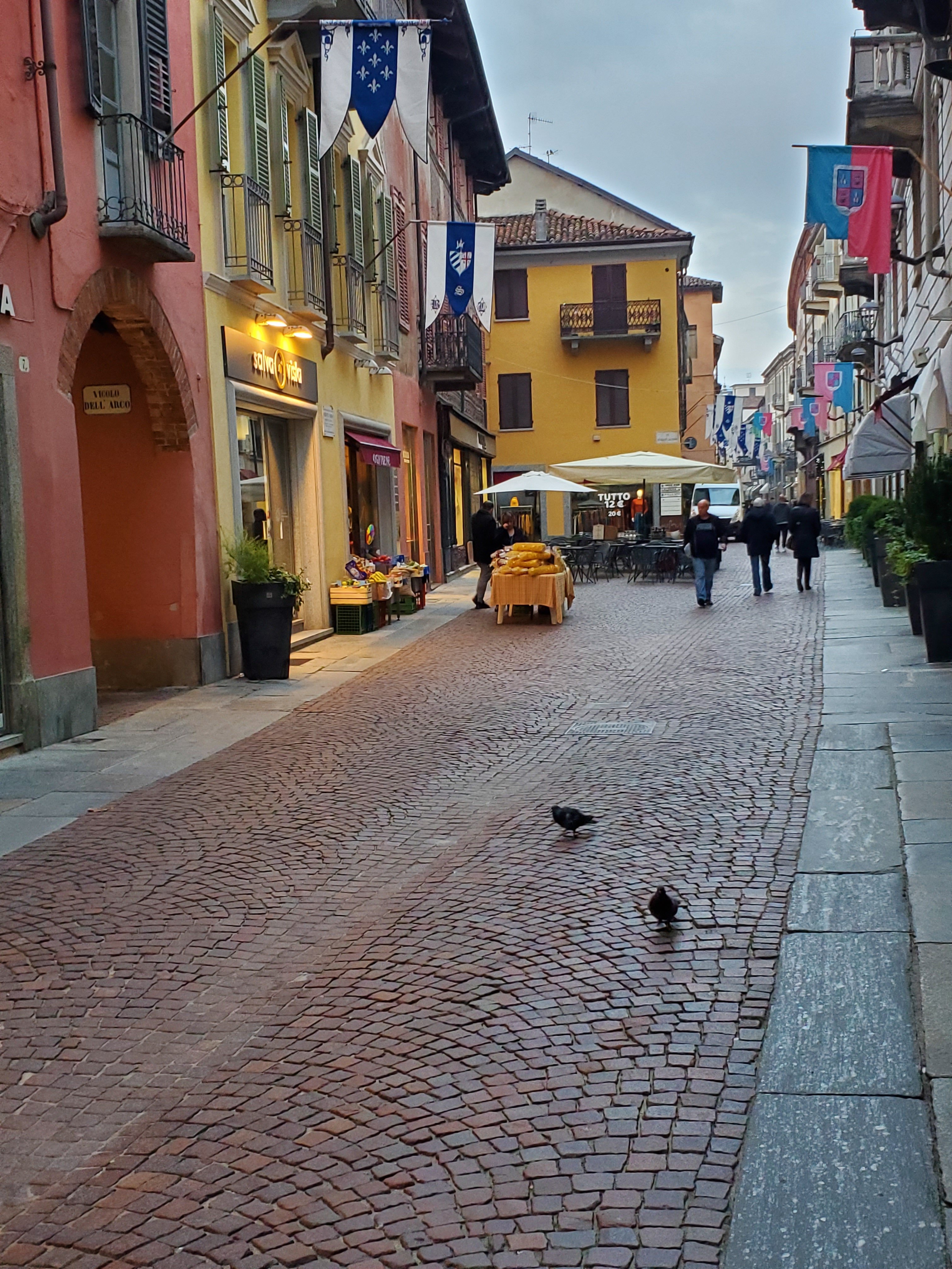 After coffee, we dropped our bags back at our apartment and headed toward our tour of underground Alba. By now – 10:30- the streets were full of people, children, strollers, and dogs, and it took some time to get around.